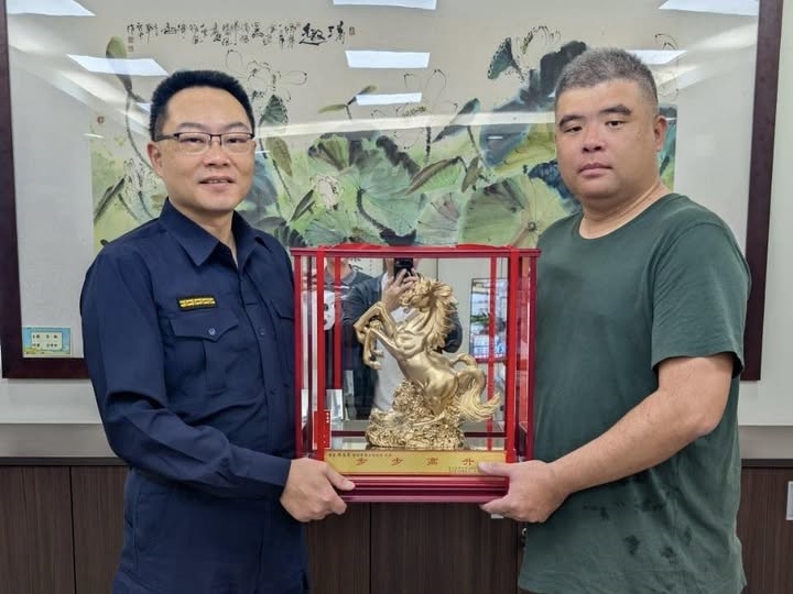 草屯分局第五組警員林冠宏陞任巡佐,分局長張基銘特別贈送紀念品並合影留念,肯定林巡佐為本分局的付出,也祝福他仕途步步高升、馬到成功。