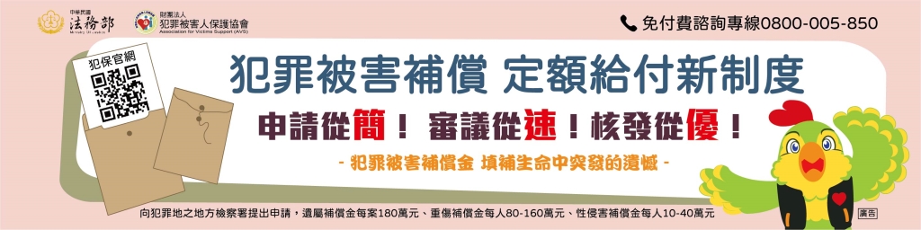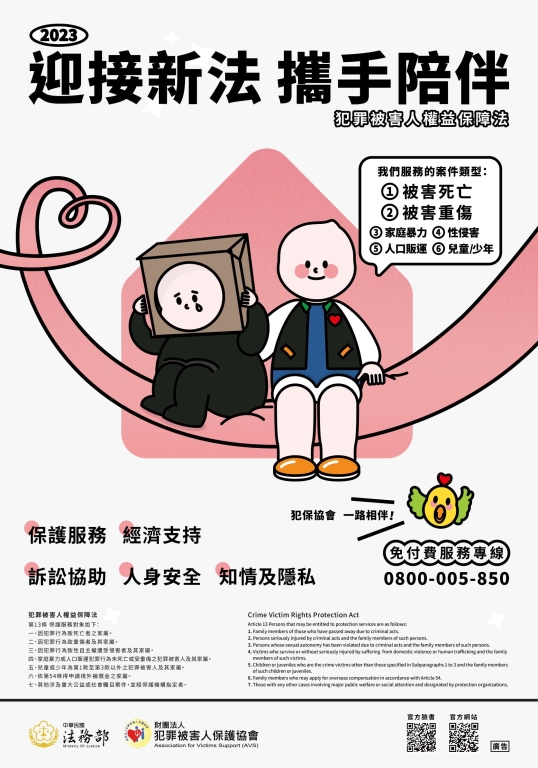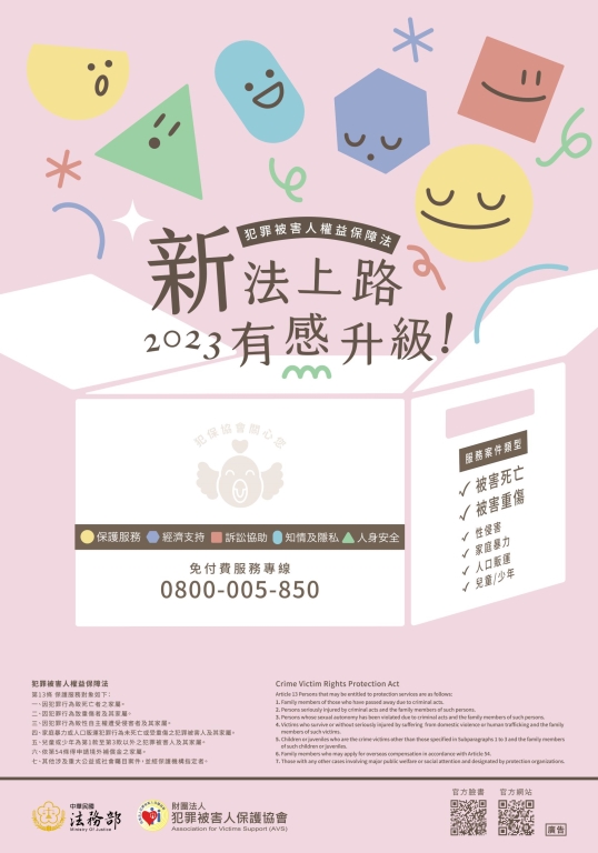 配合犯罪被害人權益保障法業於本(112)年2月8日總統華總一義字第11200007261號令修正公布名稱及全文103條,法務部督導財團法人犯罪被害人保護協會製作新法重點宣導海報、橫幅、摺頁等,歡迎推廣分享、下載運用。