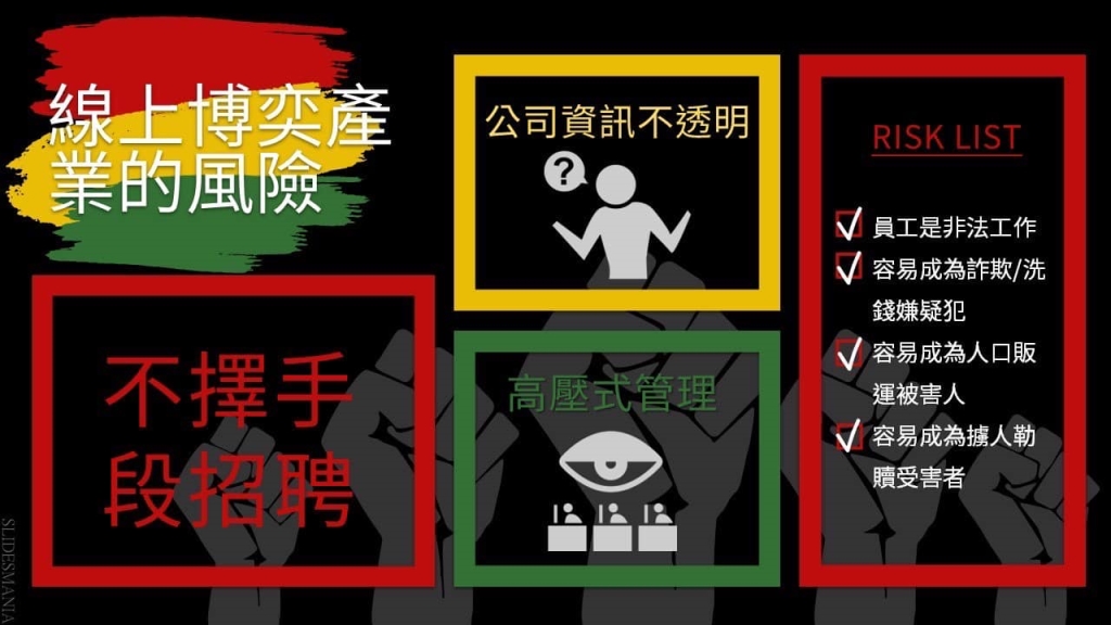 出國從事線上博奕產業屬高風險工作,特徵包括公司資訊不透明、不擇手段招聘及高壓式管理措施等等,員工容易成為詐欺、洗錢嫌疑犯,甚至淪為人口販運與擄人勒贖的受害者! 以菲律賓為例,近年菲律賓總統府反組織犯罪委員會(Presidential Anti-Organized Crime Commission, PAOCC)與菲國警方、國調局、移民局大力掃蕩非法線上博奕公司,去年陸續在克拉克市太陽谷園區、Las Piñas 市新創(前宏泰)園區、Pasay 市 SKK 園區及 Nasdake 園區等4場所, 查獲從事跨境詐欺、人口販運或賣淫集團的非法線上博奕公司。 這些非法公司除了被撤銷營業執照外,公司負責人及管理人員均依刑案偵處之外,外國籍員工則由菲國移民局以未持有效工作證、逾期居留、工作簽證所登記與實際任職公司不同等事實驅逐出境。一旦遭驅逐出境,5 年內不得再入境菲律賓。 這些案件中,非法工作的我國籍員工共有24 位(含 5 位通緝犯),目前已有6 位國人(含 4 位通緝犯)被驅逐出境;其餘18位也正由菲國移民局調查當中。 【轉載自CIB局長室粉絲專頁】