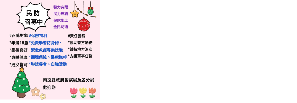 一起守護我們的家園、民防需要你 警力有限、民力無窮、保家衛土、全民防衛,本縣現正積極招募 民防志工! 民防是國家安全的基礎力量,更是守護家園的重要夥伴。加入民防,不僅能學習實用的防救災技能,也能在關鍵時刻保護家人與鄉里。 📌招募對象 年滿 18 歲,身心健康、具服務熱忱之民眾、男女皆可。 關心社區事務、願意投入公共安全工作者。 📌加入民防的好處 受訓免費,學習防身術、救護與應變技能 並享有保險福利及醫療撫卹 📌報名方式 請至仁愛分局或各派出所。