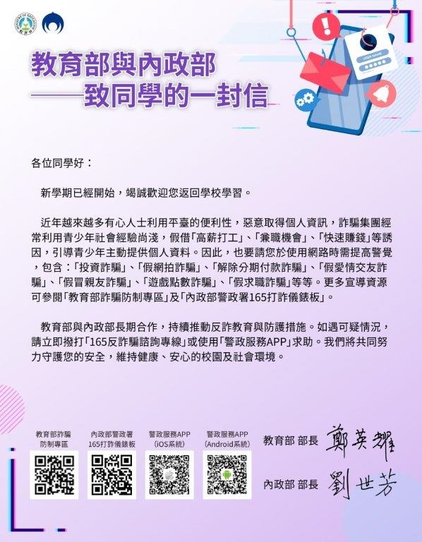 為提升學生及家長之防詐免疫力,內政部與教育部共同製作致家長的一封信,提醒家長有關小學生及中學生常遇到的詐騙手法,並提供「教育部詐騙防制專區」、「內政部警政署165打詐儀錶板」及「警政服務APP」等相關參考資訊。