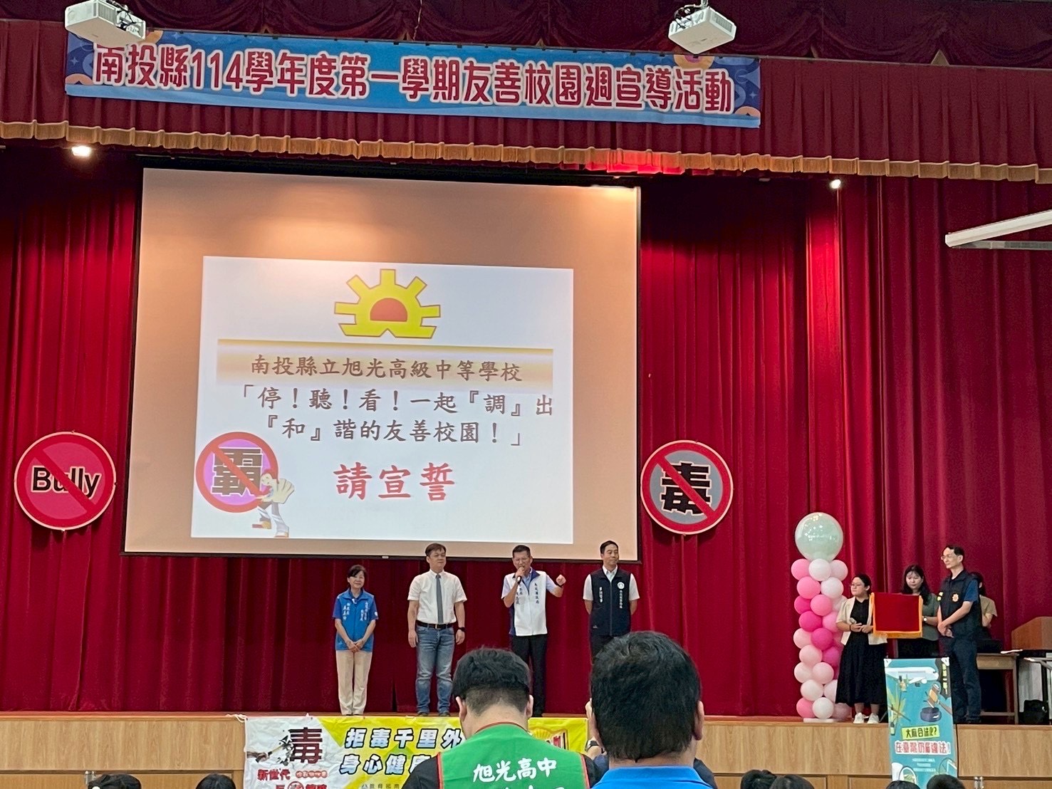 本縣「114學年度第1學期友善校園週宣導活動」於114年9月3日15時在南投縣立旭光高中舉行,本局由陳副局長志成及少年警察隊副隊長、組長出席。本次友善校園的主軸議題為「停!聽!看!一起『調』出『和』諧的友善校園!」,透過「停止傷害、聽見需求、看見希望」三大行動來防制校園霸凌事件,共同營造尊重、關懷、安全與健康的學習環境。