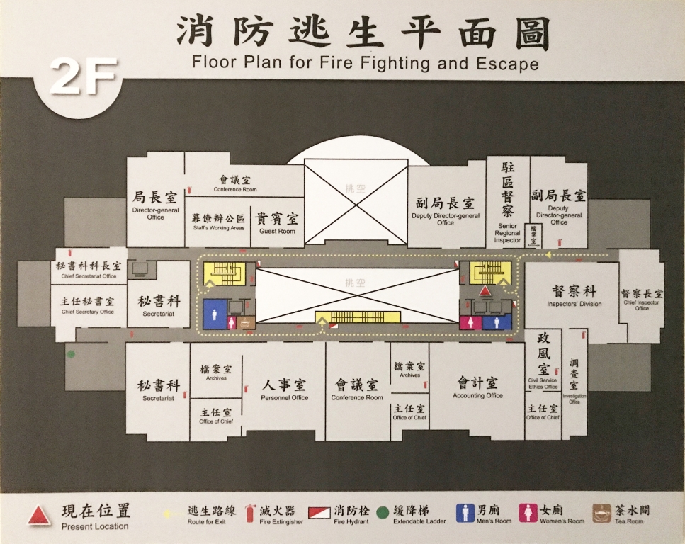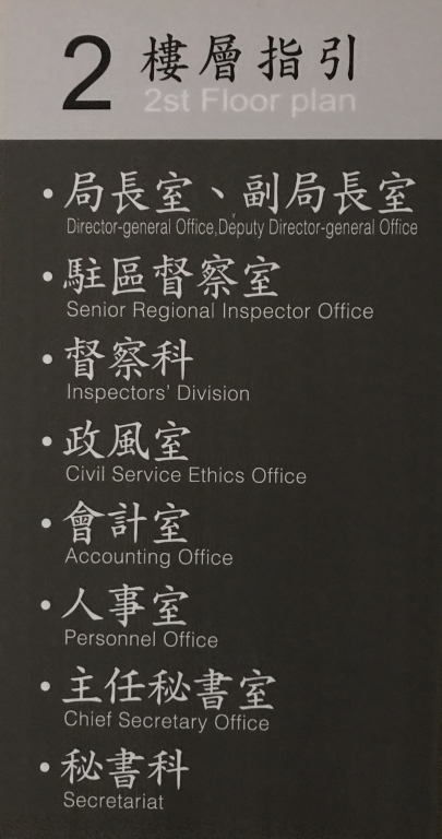 局長室、副局長室、駐區督察室、督察科、政風室、會計室、人事室、主任祕書室、秘書科
