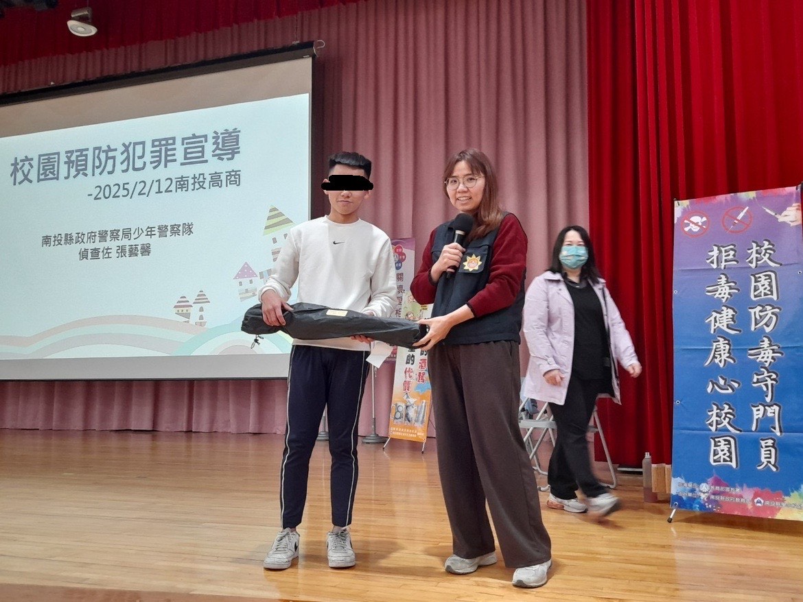 本局少年警察隊於114年2月12日結合本縣學生校外生活輔導會規劃「校園法律常識」巡迴宣講,於國立南投高級商業職業學校辦理犯罪預防宣導活動,以期強化校園安全防護機制及師生自我防護觀念,營造無毒無詐友善校園環境。