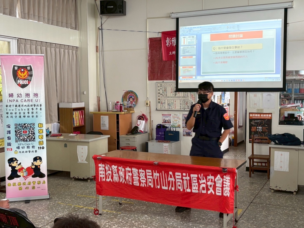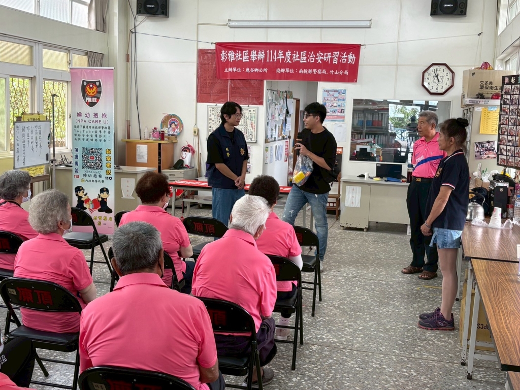 竹山警分局為傾聽民眾對治安建言、適切回應民眾需求,推展治安、交通與社區警政,在鹿谷鄉彰雅社區活動中心辦理「社區治安會議」,藉以分享轄內最新治安、交通現況,並進行反詐騙、交通、婦幼安全等相關業務宣導,提醒民眾避免受害,以減少不必要之損失。