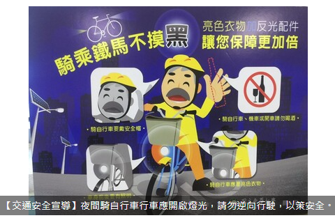 夜間騎自行車行車應開啟燈光,請勿逆向行駛,以策安全。