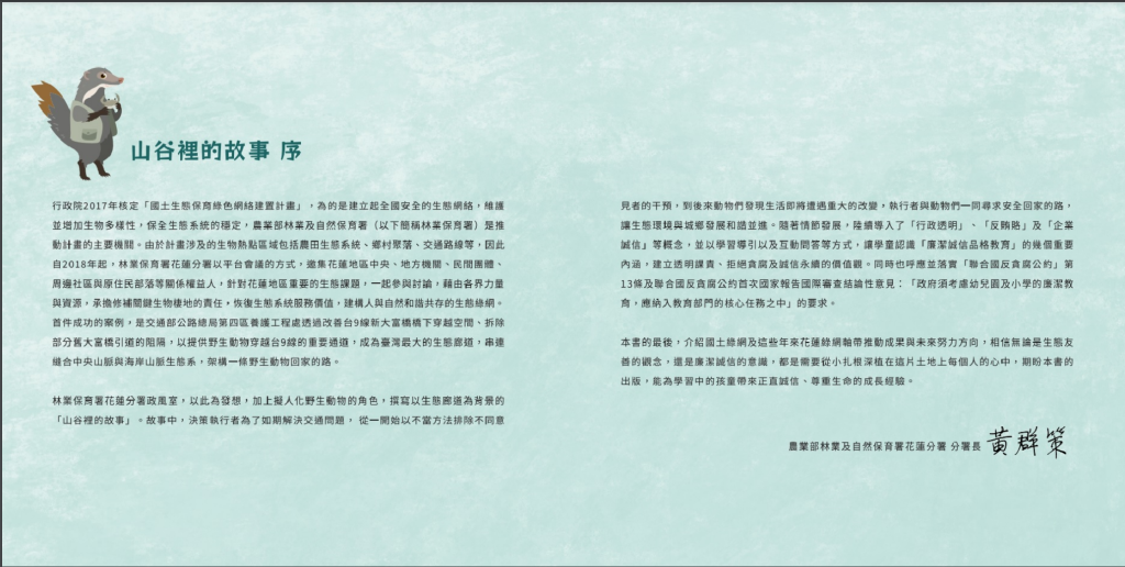 為推廣廉潔品格教育,農業部林業及自然保育署花蓮分署製作出版「山谷裡的故事」校園誠信廉潔教育電子書,電子書以花蓮生態廊道常出現的野生動物為背景,透過動物們如何解決交通問題共同尋求安全回家的路,導入「行政透明」、「反賄賂」及「企業誠信」等廉潔誠信與生態友善的概念。