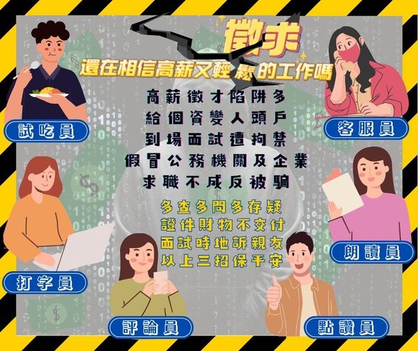 詐騙集團常利用高薪又輕鬆的徵才廣告,吸引求職者應徵