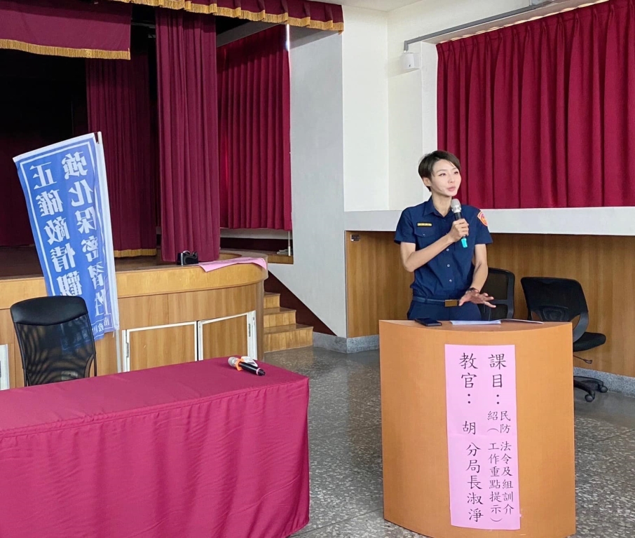 分局長胡淑淨表示,民防同仁均為社會的中堅分子,散佈於社會各角落,能夠犧牲休息時間維護地區治安、協助警察預防犯罪,精神令人欽佩,希望民防同仁能在此常年訓練中,溫故知新、熟練執勤技巧及各項防身、逮捕術,以增加執勤安全,讓擔負維持地方治安的警察,在加入民防同仁的支援後,能發揮更高的效率共同維護社會治安,正可謂「警民有互動、歹徒不敢動,警力有限、民力無窮」的最佳寫照。