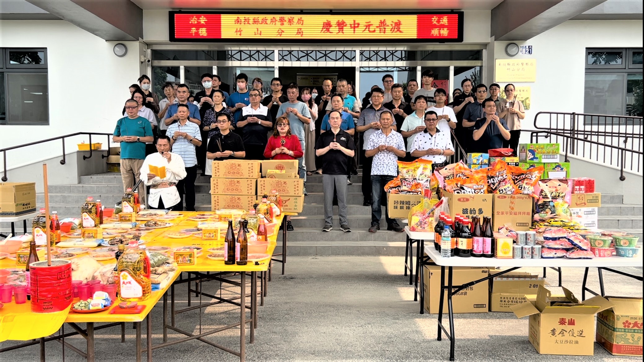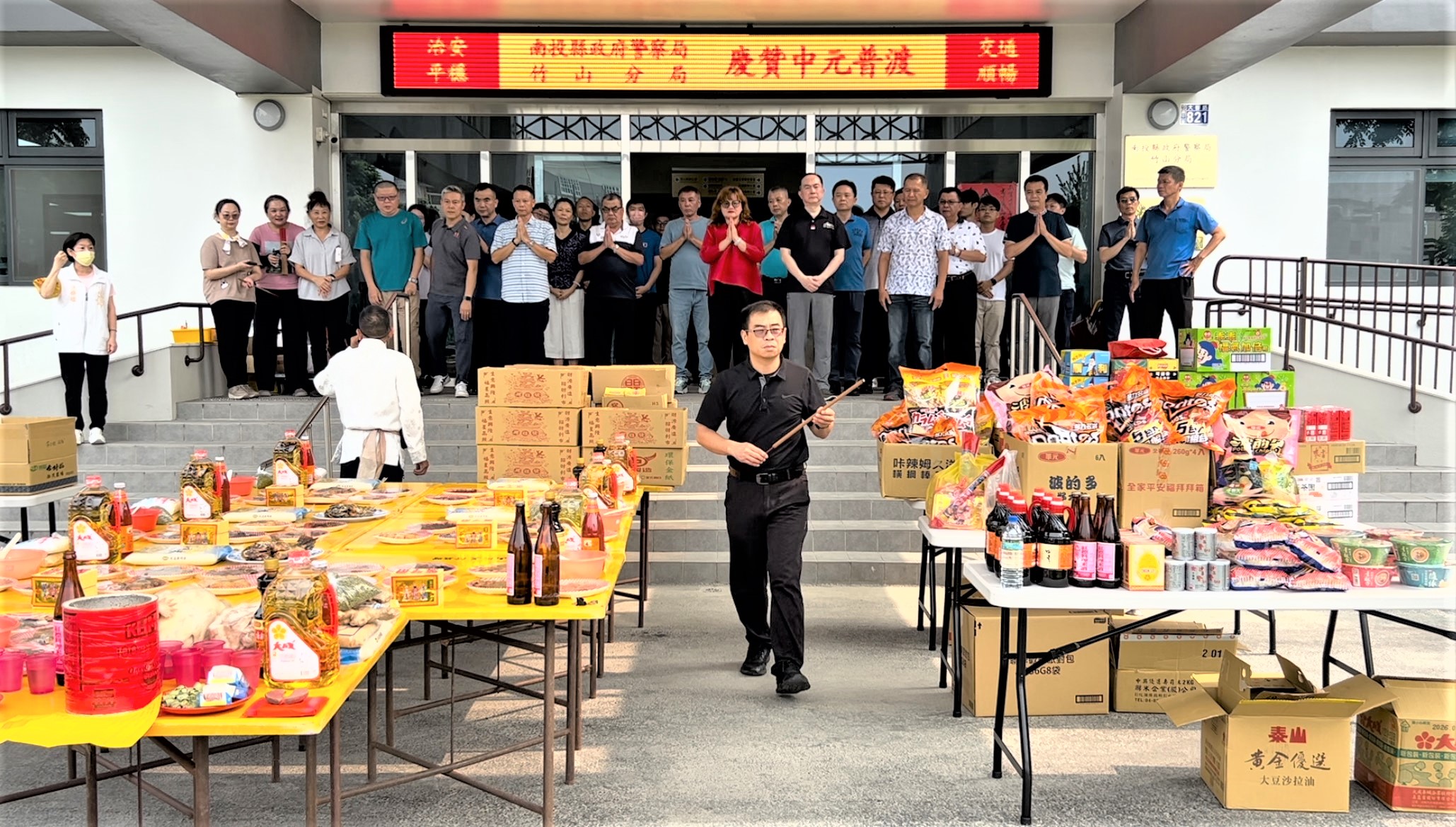 竹山警察分局今(4)日下午14時30分於分局前廣場舉行114年度中元普渡祭典,供桌擺滿各式豐盛供品,儀式由分局長許軒鳴親自主持,並率領內、外勤同仁共同參與。