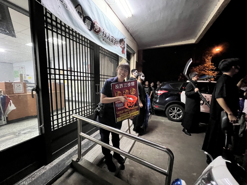 本次活動的重點站之一為竹山警察分局溪頭派出所,也特別加入「萬聖行列」,以寓教於樂的方式向民眾宣導治安與交通安全觀念。員警們化身友善警探,與民眾互動宣導,提醒大家「車輛慢、看、停,行人安全行」,延續9月交通安全月主題,呼籲駕駛人多一分注意,攜手打造行人友善的交通環境;在治安宣導部分,更結合萬聖節變裝趣味,以生動比喻提醒民眾防範詐騙:「萬聖節妖怪會變裝,詐騙集團也會假扮好人接近你!」呼籲大家遇到可疑訊息或電話時,務必提高警覺,撥打165反詐騙專線查證,別讓「變裝詐騙」得逞。