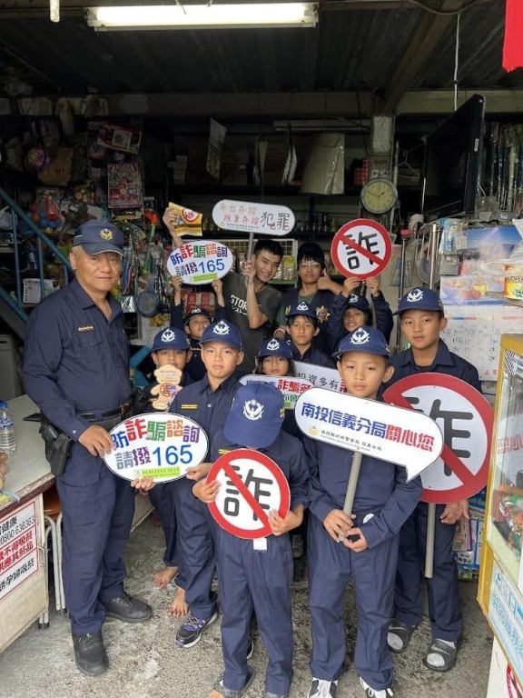信義警分局潭南派出所伍所長帶著小小警察們參觀派出所、介紹警察的工作內容,並讓小小警察與警方一起遊街進行反詐宣導,小小警察們拿著手舉牌至村裡的商家、教會及其他公共場所宣導,每每走過的地方,都吸引不少村民拿起相機拍照,看到自己村里的小朋友穿著小小警察制服都直呼「好可愛」。