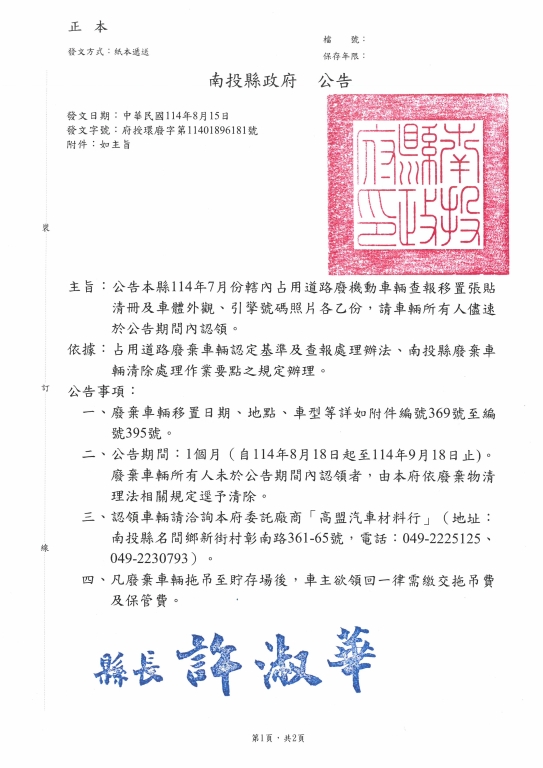 公告南投縣政府公告及執行「114年7月份佔用道路廢機動車輛查報移置張貼清冊」及車體外觀、引擎號碼、車身號碼照片各乙份,以週知民眾認領。