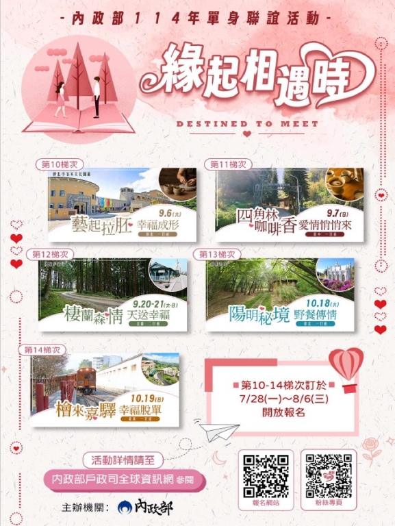 內政部114年「緣起相遇時」單身聯誼活動第10-14梯次訂於7月28日至8月6日受理報名,歡迎單身者踴躍報名。活動詳情及報名資訊請參閱內政部戶政司全球資訊網(主題資訊—單身聯誼活動專區)。