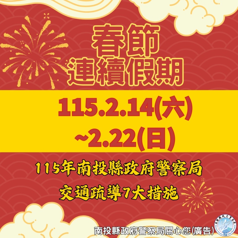 春節出門前務必先查詢路況資訊,行車途中留意交通廣播,並遵守交通規則及員警指揮,共同維護良好交通秩序。竹山警察分局也將全力投入交通疏導勤務,陪伴民眾平安出門、快樂返家,歡度安心祥和的新春佳節。
