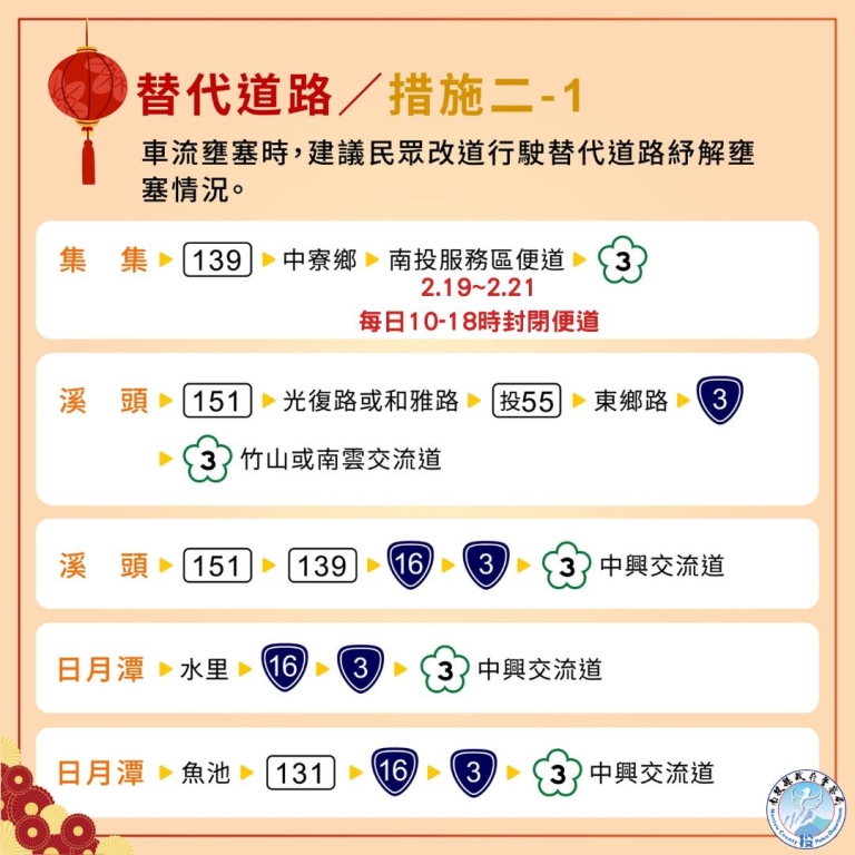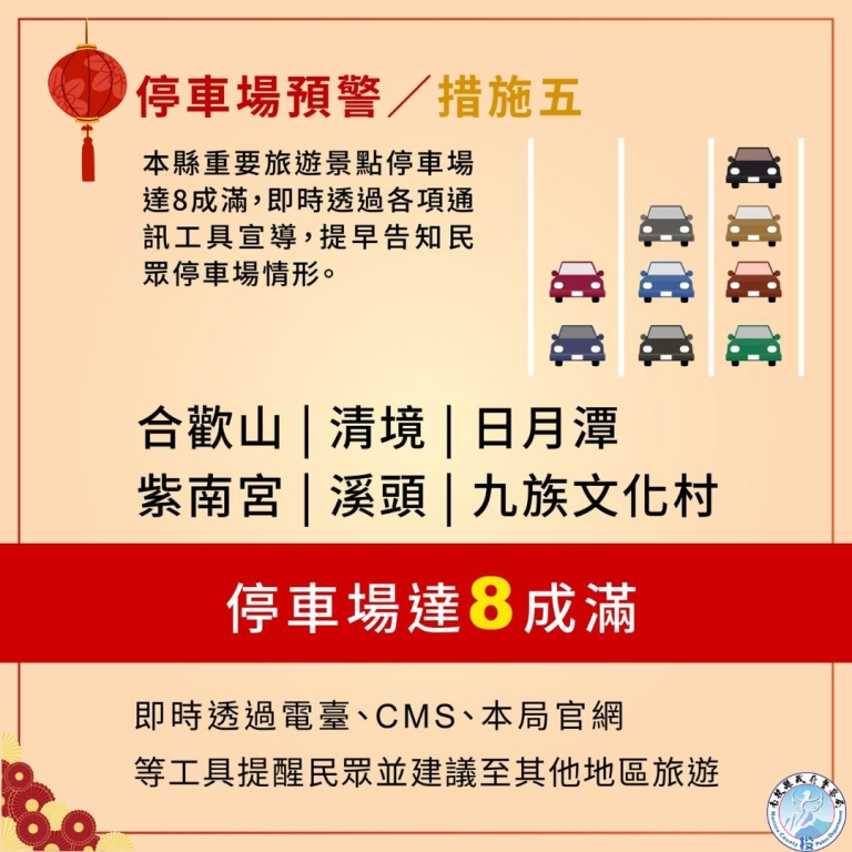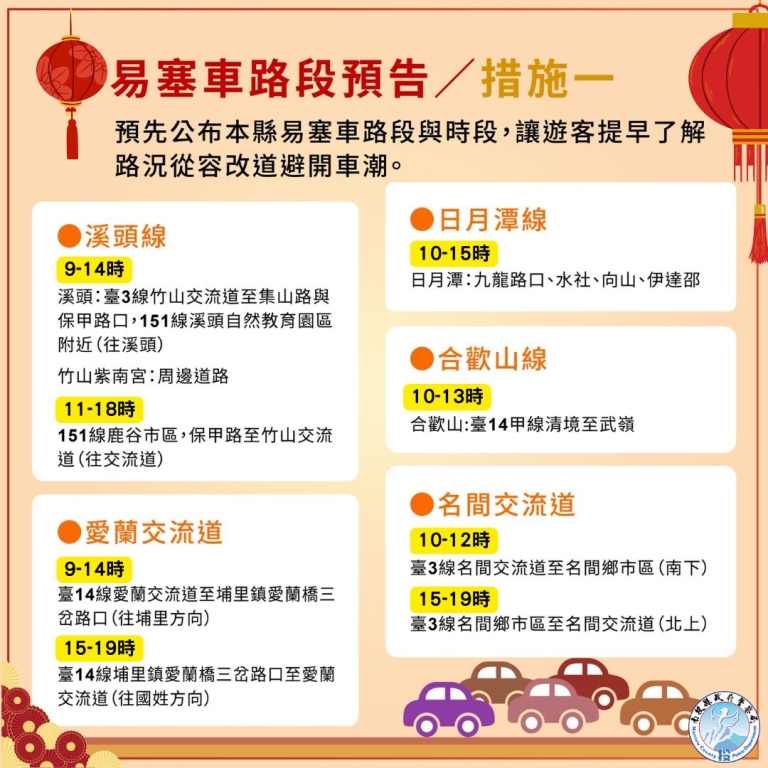 在交通資訊發布方面,將透過多元通報管道即時更新路況,並特別針對轄內主要觀光景點紫南宮及溪頭遊樂區加強停車與車流監控,當停車場使用率達8成時,即主動發布提醒訊息,透過警察廣播電臺(FM94.5)及本轄道路 CMS 可變標誌即時發布,協助民眾提早改道或選擇其他停車空間,避免因尋找停車位而造成周邊道路壅塞。省道台3線、台16線等主要幹道及重要路口,適度封閉非必要出入口,並配合號誌時相調整及員警現場指揮,減少車流交織,提升整體通行效率。另為維護春節連假期間交通安全,連假期間全縣道路將禁止砂石車行駛,降低事故發生風險。