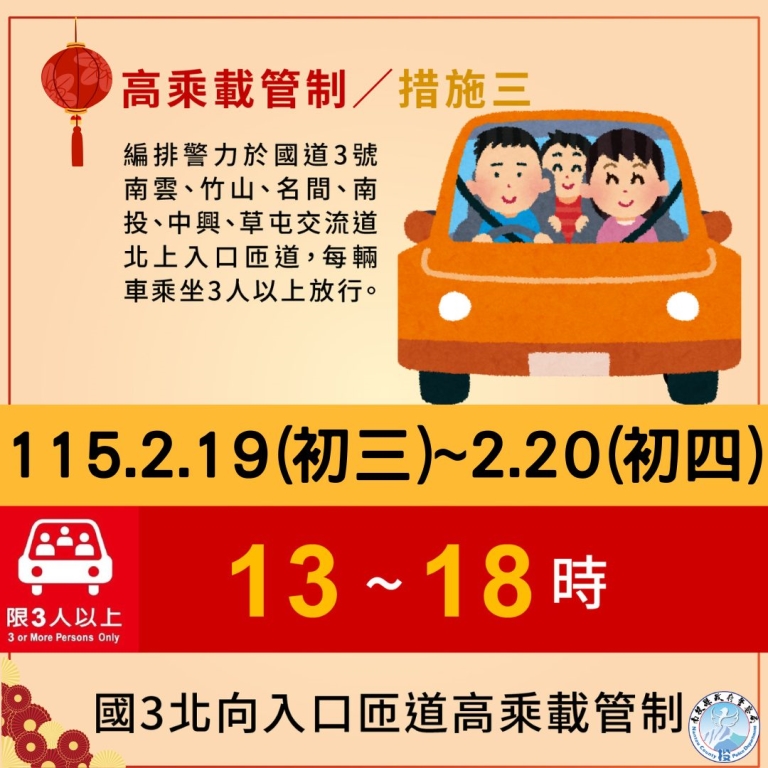 此外,為紓解國道車流,春節連假期間將配合實施國道高乘載管制措施,於115年2月19日(大年初三)至2月20日(大年初四) 13時至18時,針對國道3號交流道北上入口匝道,實施高乘載管制,限乘坐3人以上小型車輛方可進入國道,呼籲用路人多加利用共乘或替代道路行駛。