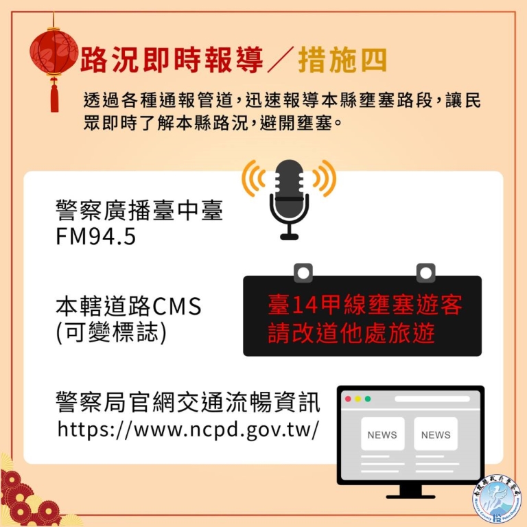 春節期間將針對轄內易壅塞路段與尖峰時段提前規劃及公告,並視即時車流狀況,機動實施交通管制與改道措施,同時引導民眾行駛替代道路及國道替代路線,有效分散車流,降低交通壅塞情形。